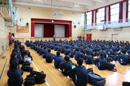 早朝6時30分に体育館に集合し、修学旅行出発式を行いました。