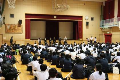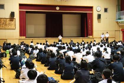 今回の修学旅行に関わっていただいたJTBのみなさん、写真屋さん、看護師さんに、生徒みなさんの大きな拍手で感謝の気持ちを伝えました。