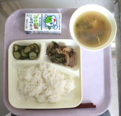 給食の献立は、プルコギ、とうふとわかめのスープ、キュウリの甘酢つけ、米飯、牛乳でした。