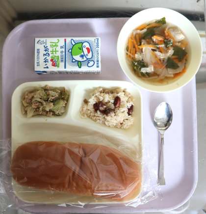 給食の献立は、金時豆の中華おこわ、中華スープ、ツナと野菜のオイスターソースいため、黒糖パン、牛乳でした。