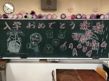 入学式の日、新入生を歓迎するため、1年生担当の先生が「くすのき学級」の黒板にメッセージを描きました。