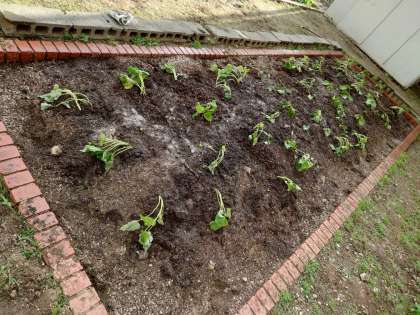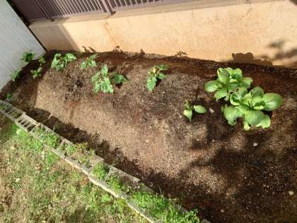 「くすのき畑」に土や肥料を入れ、キュウリ・ナス・ミニトマト・サツマイモ等の苗を植えました。