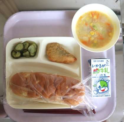 給食の献立は、サーモンフライ、豆乳スープ、きゅうりのバジル風味サラダ、おさつパン、牛乳でした。