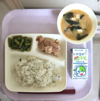 給食の献立は、鶏肉のしょうがバター焼き、とうふのみそ汁、さんどまめのごまあえ、菜飯、牛乳でした。