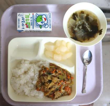 給食の献立は、和風カレー丼、すまし汁、和なし(カット缶)、米飯、牛乳でした。