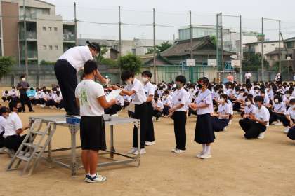 6月19日(日)開催された大阪市春季総合体育大会第4教育ブロック予選会卓球大会において、男子シングルスの部で優勝したFくん、第3位Kくん、女子シングルスの部で優勝したSさんが、中西校長先生から表彰され、生徒みなさんから大きな拍手で祝福されました。おめでとうごございます!本大会の活躍を期待しています!