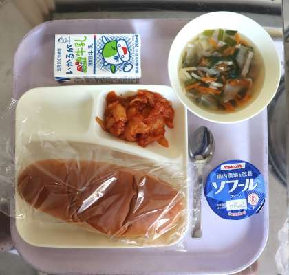 給食の献立は、えびのチリソース、中華スープ、ヨーグルト、黒糖パン、牛乳でした。