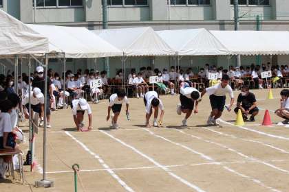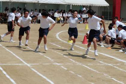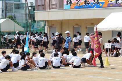 「全員リレー1」 学級担任が学級旗を持って入場しました。