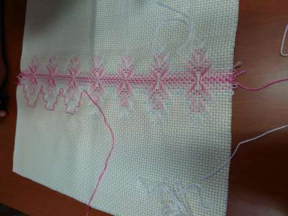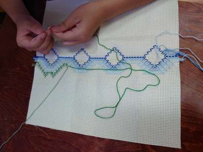 「くすのき学級」の活動で、スウェーデン刺繍をしています。