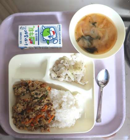 給食の献立は、他人丼、とうがんのみそ汁、キャベツの赤じそあえ、牛乳でした。