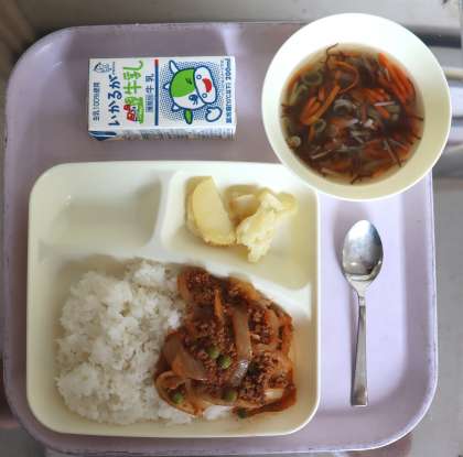 給食の献立は、タコライス、もずくのスープ、焼きじゃが、米飯、牛乳でした。