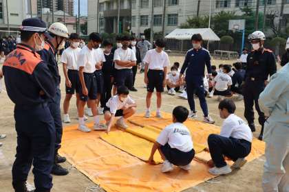 毛布、物干し竿を使った担架づくりを体験しました。