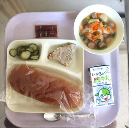 給食の献立は、かつおのマリネ焼き、ウインナーとじゃがいものスープ、きゅうりのサラダ、黒糖パン、いちごジャム、牛乳でした。