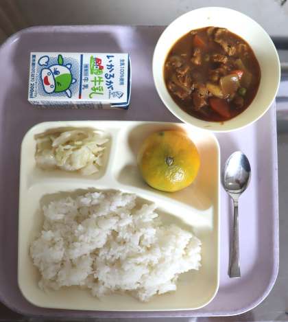 給食の献立は、ポークカレーライス、サワーキャベツ、みかん、牛乳でした。