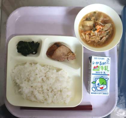 給食の献立は、なまりぶしのしょうが煮、じゃがいものみそ汁、ほうれんそうのおひたし、米飯、牛乳でした。