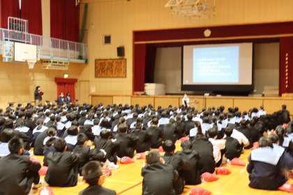 11月14日(月)6限 1年生は体育館で「福祉体験学習」として、阿倍野区社会福祉協議会のご協力のもと、視覚に障がいのある方を講師にお招きし、視覚障がいのこと、盲導犬との関係などについて話をしていただきました。