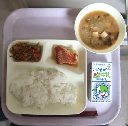 給食の献立は、あかうおのしょうゆだれかけ、なめこのみそ汁、きんぴらごぼう、米飯、牛乳でした。
