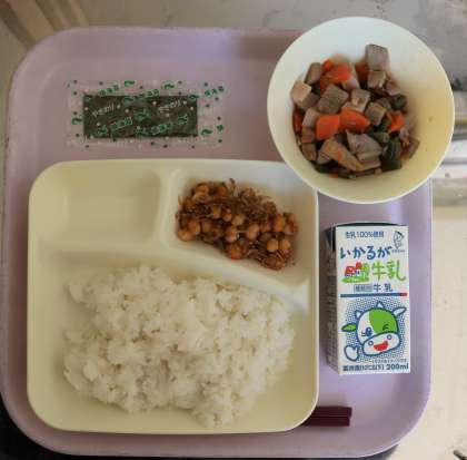 給食の献立は、筑前煮、じゃこ豆、焼きのり、米飯、牛乳でした。