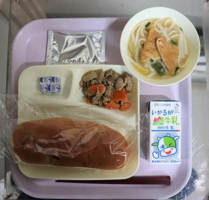 給食の献立は、豚肉とごぼうび煮もの、なにわうどん、固形チーズ、ぶどうパン、牛乳でした。