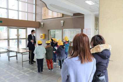 2月16日(木)午前 黄色の帽子をかぶった、晴明丘小学校2年生9名が「まちたんけん」で本校を訪れてくれました。