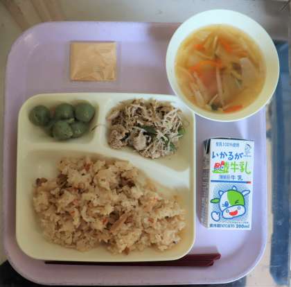 給食の献立は、豚肉と野菜のいためもの、すまし汁、きな粉よもぎだんご、かやくご飯、牛乳でした。