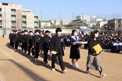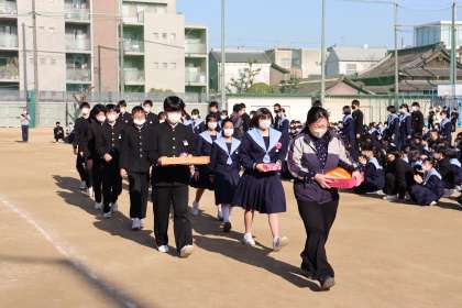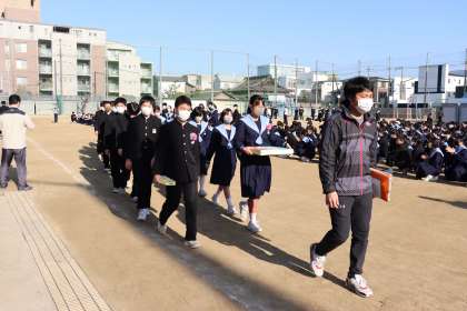 1,2年生から感謝の拍手につつまれ、4組、5組、6組が送られました。