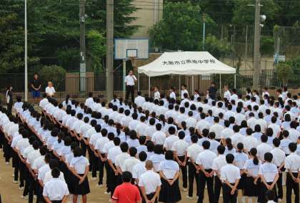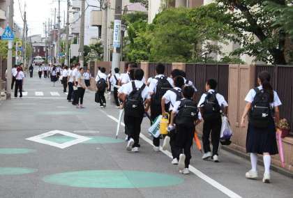 8月25日(火)朝、学校前のグリーンロードには、「おはようございます」と元気な生徒の声が響いていました。