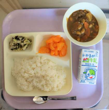 給食の献立は、牛肉と大豆のカレーライス、キャベツのひじきドレッシング、みかん(缶)、米飯、牛乳でした。
