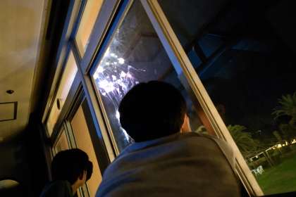 緊急放送のあとオーシャンビューの夜空に花火が上がり、各部屋から歓声があがりました。