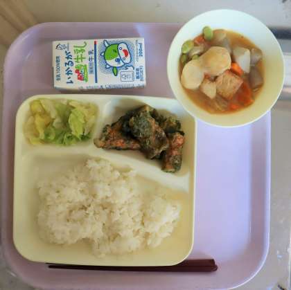 給食の献立は、ちくわのいそべあげ、あつあげとさといものみそ煮、あっさりキャベツ、米飯、牛乳でした。