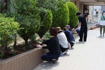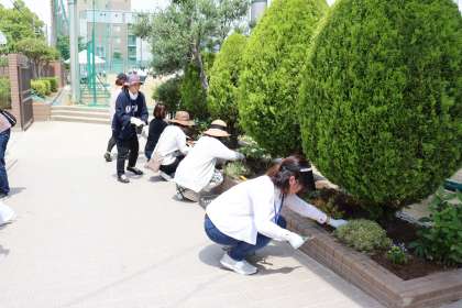 6月1日(木)梅雨の合間をぬって、午前10時からPTA施設・保健委員会のみなさんがグラウンド入り口にある花壇、プランターの花を植え替えてくださいました。