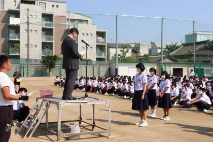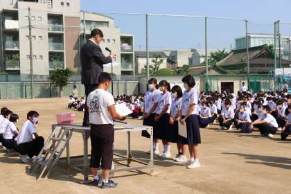 6月19日(月)朝、全校集会において、大阪市陸上フェスタで、女子200mに出場し、27秒29で第2位となったSさん、大阪市春季総合体育大会で、女子200mに出場し、27秒02で第2位となったSさん、4×100mで第3位になった、Sさん、Kさん、kさん、Hさんが校長先生から表彰状が伝達され、生徒のみなさんから大きな拍手で祝福されました。
