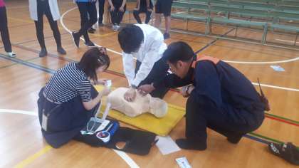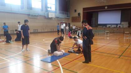 本日は1日目です。DVDを見て学習した後、人体模型で胸骨圧迫訓練、AEDの使用の仕方を学びました。
