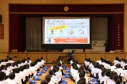 7月4日(火)6限、1年生は体育館で、阿倍野警察署交通課より講師をお招きし、交通安全教室を実施しました。