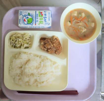 給食の献立は、豚肉のたつたあげ、みそ汁、切干しだいこんのゆずの香あえ、米飯、牛乳でした。