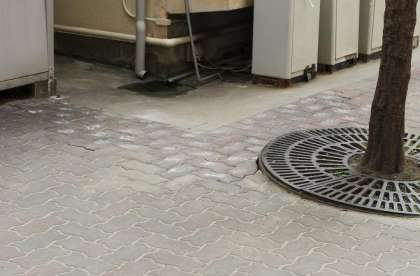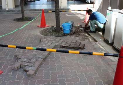 10月5日(月)午後、中庭の樹木の成長した根に押し上げられて、ウォータークーラー付近のインターロッキングが凸凹になっている箇所がありましたが、校内営繕作業によって改修しました。