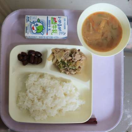 給食の献立は、豚肉の甘辛焼き、とうがんのみそ汁、金時豆の亨もの、米飯、牛乳でした。