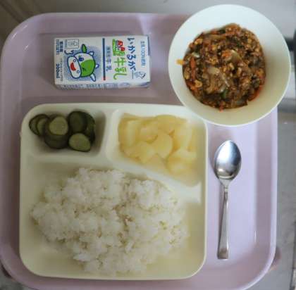 給食の献立は、大豆入りキーマカレーライス、きゅうりのサラダ、洋なし(カット缶)、米飯、牛乳でした。
