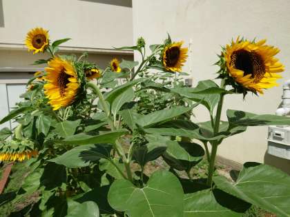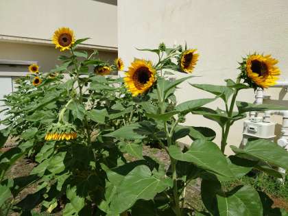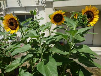 1学期の終わり頃に種まきした「くすのき畑」の「秋咲きヒマワリ」が、満開になりました。