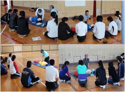 会議室でDVD映像による「応急手当の手順」「止血の方法」などの講義を受けて、体育館で「心肺蘇生方法」「AEDの使用方法」について実技講習を受けました。