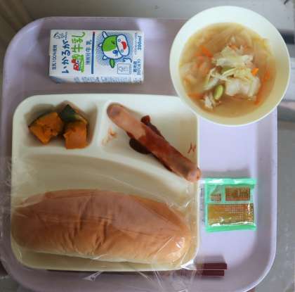 給食の献立は、ウインナーのケチャップソース、スープ、焼きかぼちゃ、パン、りんごジャム、牛乳でした。