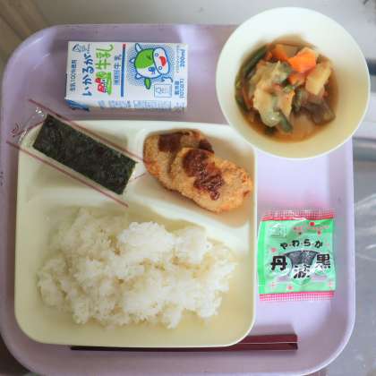 給食の献立は、みそカツ、じゃがいもと野菜の煮もの、焼きのり、ソフト黒豆、米飯、牛乳でした。