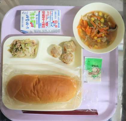 給食の献立は、焼きシューマイ、中華みそスープ、ツナと野菜のオイスターソースいため、パン、ソフトマーガリン、牛乳でした。