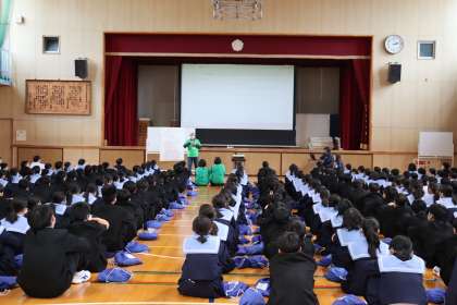 12月11日(月)6限 1年生は体育館で「福祉学習」として、阿倍野区社会福祉協議会のご協力のもと、講師をお招きし、視覚障がいのこと、手話、介助犬、盲導犬等について話をしていただきました。