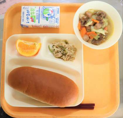 給食の献立は、ポトフ、ツナと野菜のソテー、いよかん、黒糖パン、牛乳でした。
