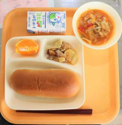 給食の献立は、鶏肉とじゃがいものガーリック焼き、ウインナーとてぼ豆のスープ、デコポン、黒糖パン、牛乳でした。