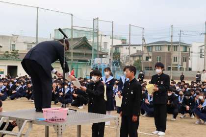 続いて、男子ソフトテニス部のHさん、Uさんが、大阪市ソフトテニス研修大会の個人戦に出場し、見事準優勝に輝きました。校長先生から表彰状が伝達され、生徒のみなさんから大きな拍手で祝福されました。