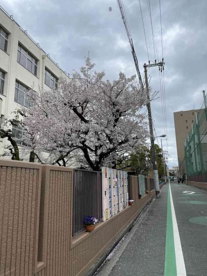 正門側の桜も満開で、新入生の部活動参加を迎えています。