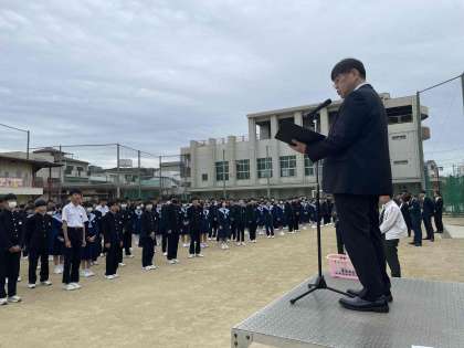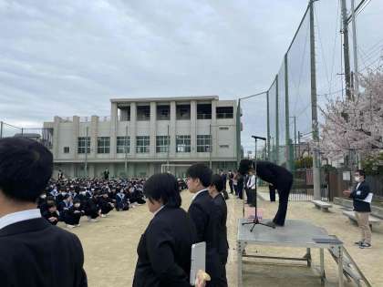 本日は、グラウンドにて着任式と始業式をおこないました。