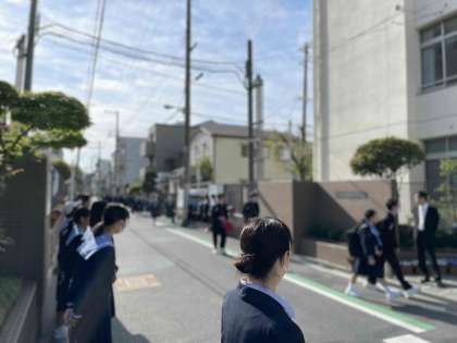 今日の挨拶は、生徒会と部活動のボランティア(女子バレーボール部、水泳部、陸上部)の生徒たちです。